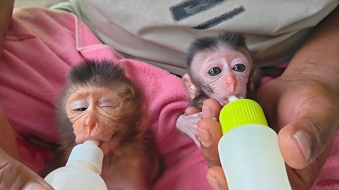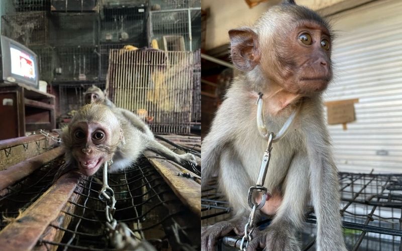 Behind the cold green wires of a cramped cage, two young monkeys sit pressed together, their small bodies curled inward as if trying to disappear. Their eyes—wide, dark, and painfully …